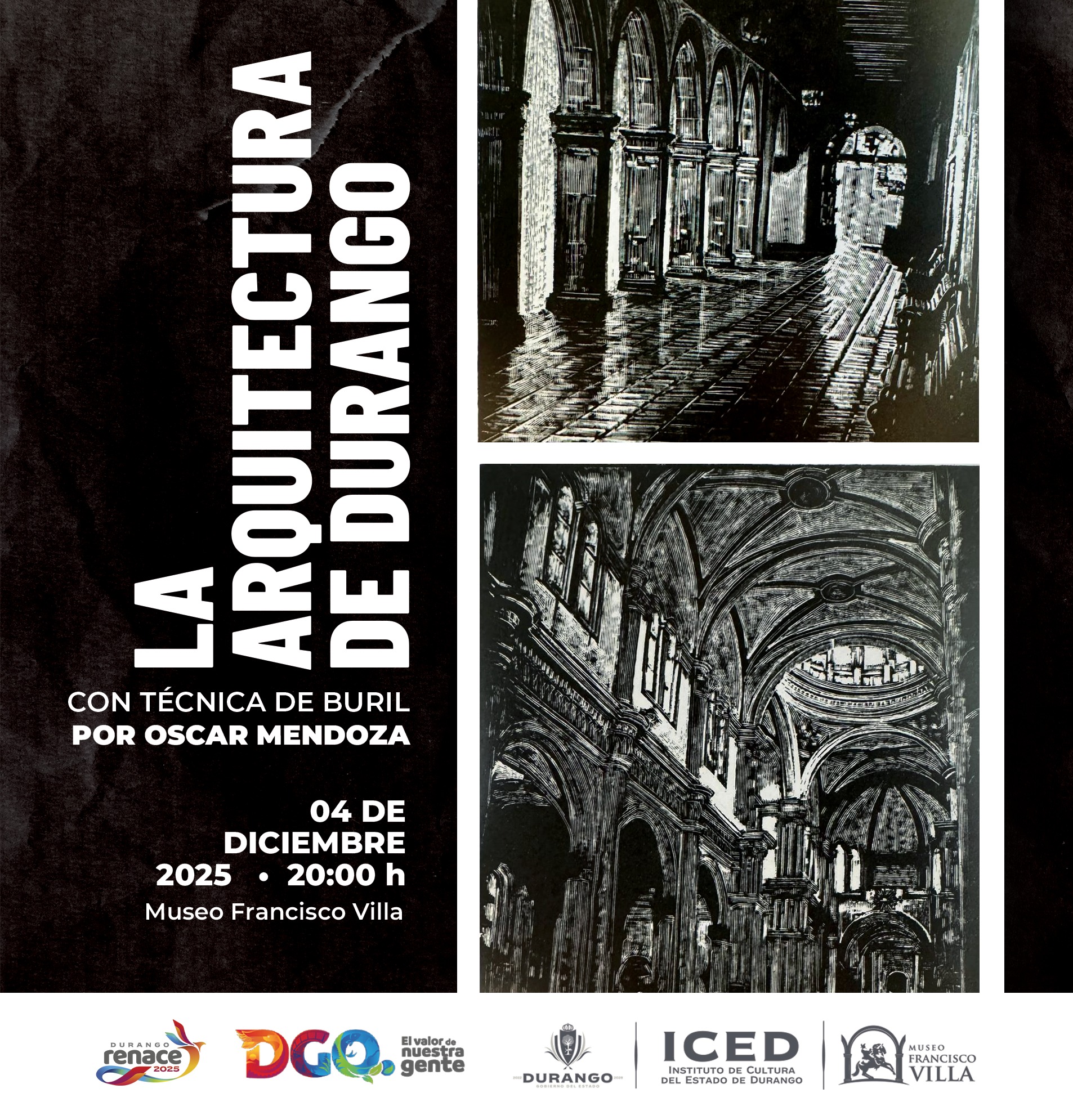 Te invitamos a la inauguración de la exposición “La arquitectura de Durango”, una muestra en técnica de buril del artista Oscar Mendoza.